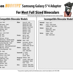 The HookUpz™ adaptor easily connects your Samsung Galaxy S4 to your full-sized (32mm-50mm objective lens) Binocular. The HookUpz™ Binocular Adapter comes included with two interchangeable rubber rings that allow the adapter to fit most full-sized binoculars that have an outer eyepiece housing diameter between 40mm-44mm. Once you determine which ring works best, press firmly for a tight hold to the eyepiece.