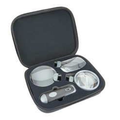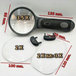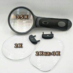 เป็นเว่นขยายมือถือและมีไฟ Remov-A-Lens เป็นเซ็ตมาในกล่องอย่างดี ประกอบด้วย ด้ามจับ 1 ชิ้น พร้อม 3 เลนส์ ให้เลือกใช้งานตามใจชอบ ได้แก่ 1) เลนส์กลมไม่มีขอบ อัตราขยาย 2 เท่า ขนาดเส้นผ่าศูนย์กลาง 11 cm, 2) เลนส์ทรงสี่เหลี่ยมไม่มีขอบ อัตราขยาย 2 เท่า และ 3) เลนส์กลมมีขอบเพื่อป้องกันรอยขีดข่วน อัตราขยาย 3.5 เท่า เปลี่ยนเลนส์เองได้ง่ายดาย พร้อมไฟส่องหลอด LED (ใช้แบตเตอรี่ 3xAAA ซึ่งไม่รวมในชุด) เลนส์ใส คมชัด เหมาะสำหรับติดบ้านเพท่ออ่านหนังสือ ทำงานฝีมือ ขยายวัตถุทั่วไป คุ้มค่ามาก