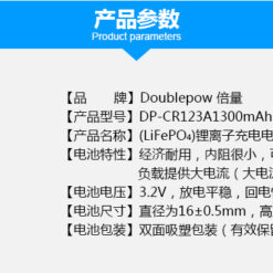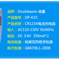 ชุดแบตเตอรี่พร้อมที่ชาร์ต Doublepow มาพร้อมแบต CR123A แบบ LiFePO4 1300mAh 2 ก้อน (3V) และที่ชาร์ต DP-K15 สามารถใส่แทนแบตเตอรี่ Lithium ได้เลย ไม่ต้องห่วงว่าแรงดันจะสูงเกินไปทำให้อุปกรณ์พัง (แบตชาร์ต CR2/CR123 ทั่วไปจะมีแรงดัน 3.7V ซึ่งอุปกรณ์หลายชนิดไม่ได้ถูกออกแบบให้ทนต่อแรงดันสูง) ความจุสูงกว่าแบต CR123 Lithium ชั้นดีที่ขายในท้องตลาด ที่สำคัญคือนำกลับมาชาร์ตได้ ไม่ต้องคอยจ่ายก้อนละ 1xx บาท เหมาะสำหรับผู้ที่ใช้งานอุปกรณ์ใช้แบต CR123A, CR-123A แบบต่อเนื่อง