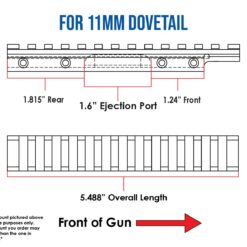 It is available in 3/8″ and 11mm dovetails. Determine which dovetail you have by measuring across the top of the dovetail. If you measure 0.437″ you have an 11mm dovetail. If you measure 0.5″ you have a 3/8″ dovetail.