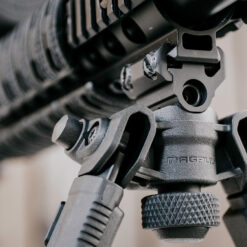A soft rubber bipod locking knob cap is attached to the locking knob gives users a steady, non-marring forward rest while the bipod is folded. Additionally, its staggered soft rubber feet hold fast on a variety of shooting surfaces and are easily removed with a roll pin punch. Should users choose to change feet, the Magpul Bipod’s legs accept most Atlas pattern bipod replaceable feet, except for the Atlas 5-H style.
