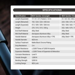 NEX Quicker batons are with our patented NEX Lock design, which makes the batons 2-m impact-resistant, smooth to open and close, and less wobbly. According to your personal preference and application scenarios, you may choose its 17″ (Airweight), 21″ (Airweight / Trainer / Steel), 23″ (Airweight / Steel), 26″ (Steel), and 28″ (Steel) models. The airweight ones are made of aerospace aluminum alloy and alloy steel, and so are more lightweight, while the steel ones are made of alloy steel, which can deliver a heavier strike. NEX Quicker batons are your reliable partners.