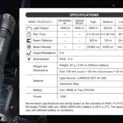 BATTERY: 1 x 18650 rechargeable (included) or 2 x CR123A