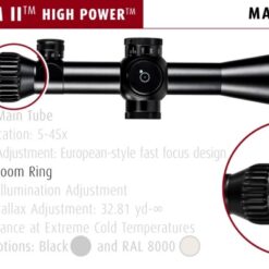 Developed for the toughest long-range conditions the 5-45×56 PM II High Power uses the best optics in a solid and rugged riflescope design. Having an outstanding optical performance over the entire magnification range, it is perfect for identifying even small targets or spotting your results. In addition it can be equipped with our Multi Turn II (MT II) turret with fine 0.5 cm/100 m click value for precise zeroing and more accurate shooting. This is why it has become more popular among ambitious competition shooters and military units alike.