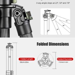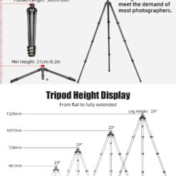 ✪Folded length 20”(50cm), Height of tripod with legs fully extended 56”(143cm), and min height goes to 8.3”(21cm)