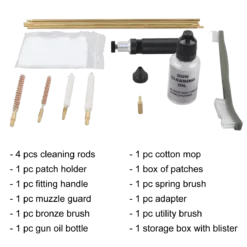 - Fitting Handle, Bronze Brush, Cotton Mop, Spring Brush, Patch Holder, Muzzle Guard, Jags, Oil Bottle, Patches, Adapter, ABS Plastic Case