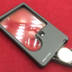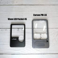 แว่นขยาย 2 เลนส์สำหรับพกพาติดตัว เพื่ออ่านหนังสือ ยี่ห้อ Vixen รุ่น LED Pocket 45 หน้าเลนส์ขนาด 45 x 45 ซม อัตราขยาย 2 เท่า พอดีสำหรับอ่านหนังสือ และมี Spot Lens อัตราขยายสูง 5 เท่า สำหรับดูเฉพาะจุด มีไฟหลอด LED เพิ่มความสว่าง ในชุดมาพร้อมซองผ้า เพื่อเก็บยามพกพาไม่ให้เลนส์เป็นรอย