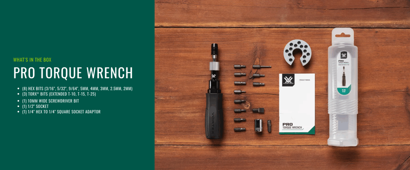 Ensure precision in every turn with the Vortex® Pro Torque Wrench. Offering adjustable torque settings from 10 to 90 in-lbs, it’s designed to eliminate both over and under tightening when mounting riflescopes, adjusting bolts, and rifle action screws. Its ergonomic design and locking bit holder enhance control and accuracy. A wide array of bits included and backed by the Vortex® VIP® Warranty, this kit is an indispensable asset for any discerning shooter.